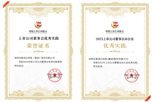 近日,南山控股荣获“2025年度上市公司董事会优秀实践案例”及“2025年度上市公司董事会办公室优秀实践”两项荣誉。